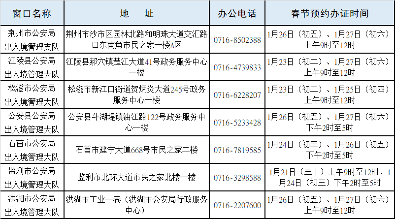 为方便春节期间群众办理出国(境)证件,荆州全市公安机关出入境管理部门推出节日预约办证服务、急事急办暖心服务,确保2023年春节期间全市公安出入境便民利企服务“不打烊”,满足群众办证需求。