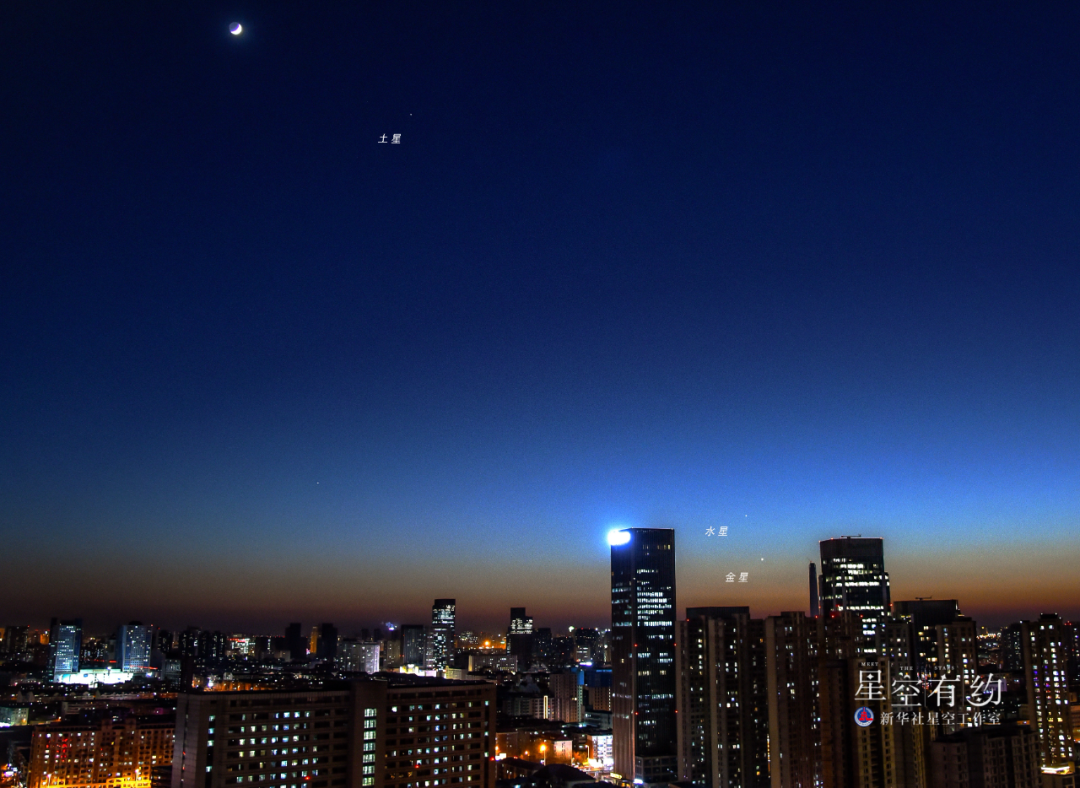 23日傍晚,在观看金星和土星的同时,感兴趣的公众还会看到一弯细细的蛾眉月出现在两颗行星的左下方不远处,非常值得观测和拍摄。不过由于月亮很细很细,需要仔细寻找才能发现。