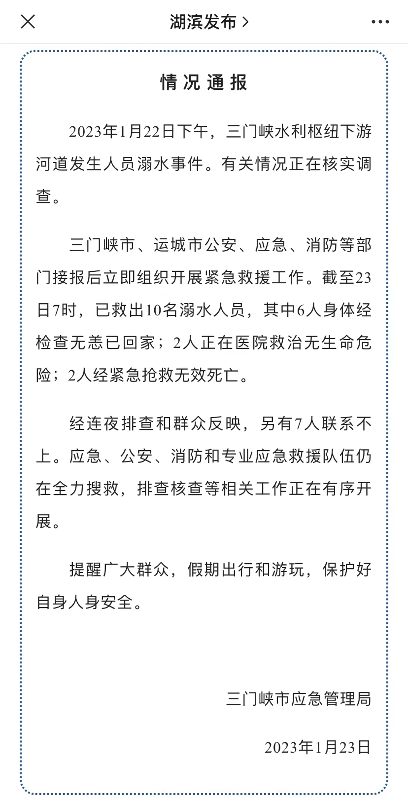 1月22日,河南三门峡大坝附近多人被河水冲走一事引发关注。23日,“湖滨发布”通报称,截至23日7时,2人经紧急抢救无效死亡,另有7人联系不上。