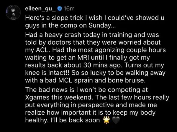 虽然最终结果显示膝盖仍然完好,但谷爱凌还是决定退出比赛。“即便仍需带着内侧副韧带扭伤、前交叉韧带扭伤以及淤青离开医院,我还是感到十分幸运。坏消息是,我不能参加X Games的比赛了。过去的几个小时里我理清了自己的思路,并且意识到,保持身体健康是非常重要的。我很快就会回归赛场!”
