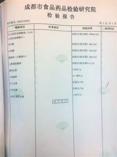 两周后,检测结果终于出炉:所有项目全部合格。未检出苯甲酸、山梨酸。“这是两种最常见的、安全性能相对较高的防腐剂,检品中未检出苯甲酸、山梨酸,基本可以说明其中未添加防腐剂。”成都市食品药品检验研究院副院长谯斌宗表示,“样品微生物项目合格意味着其生产环境卫生状况良好,不会引起食品变质,从而危害人体健康。”