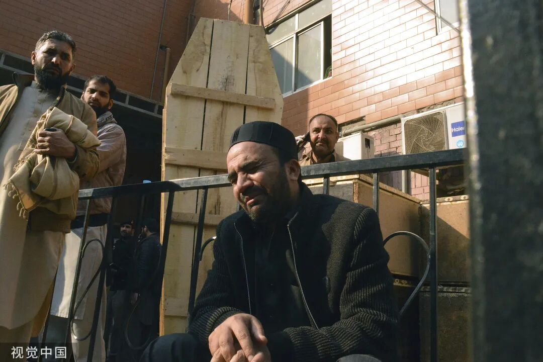 当地时间2023年1月30日,巴基斯坦白沙瓦,一名男子在医院为其在清真寺自杀式炸弹袭击中丧生的亲人进行悼念。