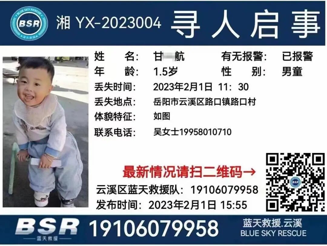 2月1日上午,湖南岳阳一名年仅1岁10个月的男童在家门口丢失,至2日下午还没有找到。当地政府工作人员表示,当天组织了100多人帮忙寻找,目前警方已经介入。