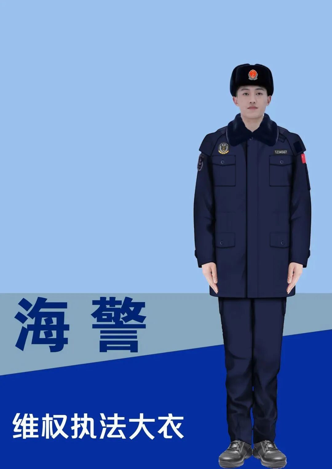 海警维权执法服充分考虑海警海上维权执法任务需求特点,具备舒适透气、高强耐磨、挺括、色牢度高、抗静电、适应弹性等功能,在设计思路上,有别于军队、人民警察和其他现有行业服装,在借鉴优点的同时,增强识别性和安全性,充分展示国威和执法严肃性。海警维权执法服主要有夏维权执法服、春秋维权执法服、冬维权执法服、维权执法大衣和维权执法分体雨衣,并配有维权执法帽、冬帽、套式肩章、勤务章、执法号、国旗臂章、海警臂章、舰艇作训鞋等配套服饰。海警维权执法服的配发使用有利于加强海警执法规范化建设,督促执法人员严肃仪容仪表和执法风纪,树立良好执法形象、维护执法权威。