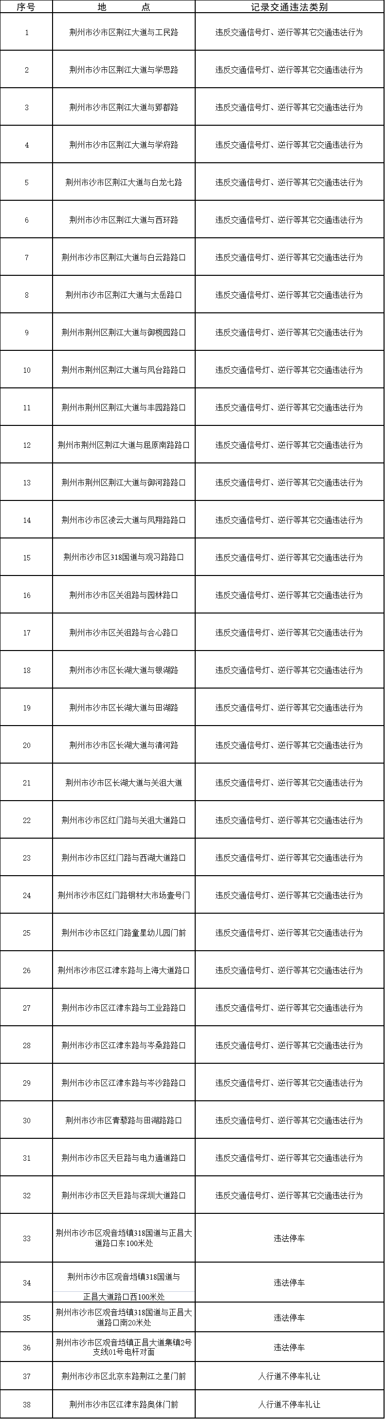 根据道路交通安全管理需要,拟在以下道路设置交通技术监控设备,按照《行政处罚法》《道路交通安全法》等法律法规有关要求,荆州市公安局交通管理局将于2023年3月1日零时起启用新增部分电子监控设备抓拍道路交通违法行为,现将相关设置地点向社会公布,请广大交通参与者自觉遵守道路交通安全法律法规。