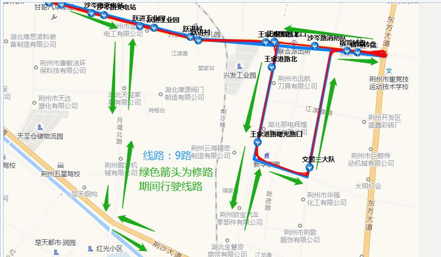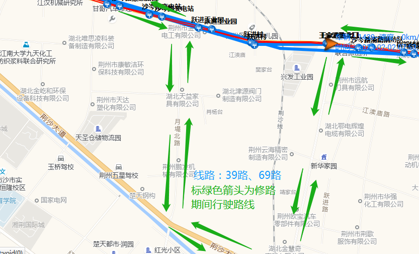 修路期间行驶路线:沿江路-便河西路-(江汉南路)-北京路—豉湖路—沙岑路—月堤北路—荆沙大道—王家港路—沙岑路—东方大道—318国道