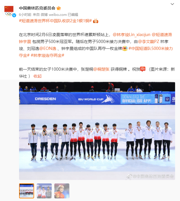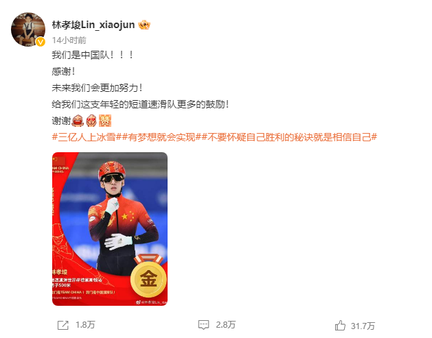 赛后,林孝埈通过社交媒体发声:“我们是中国队,未来我们会更加努力,给我们这支年轻的短道速滑队更多的鼓励!”