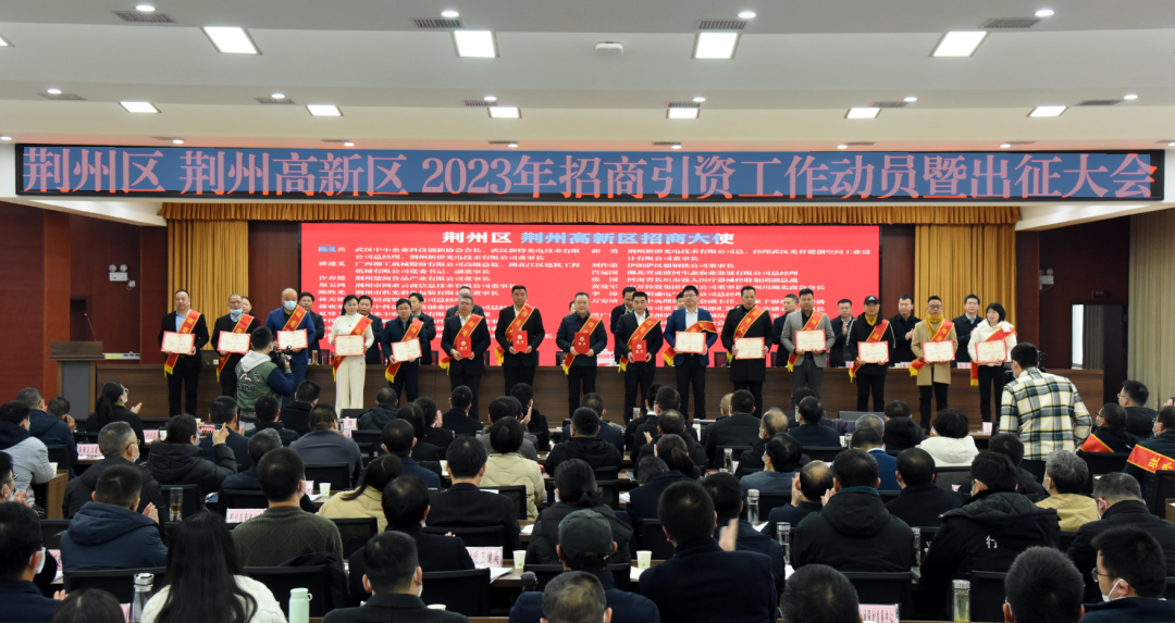 2月6日,荆州区、荆州高新区召开2023年招商引资工作动员暨出征大会,荆州区委书记、荆州高新区党工委书记万玲玲,荆州区、荆州高新区领导张远重、朱翊、 张盛勇、路明、陈任、周远栋、王勇、肖西根、王厚强、黄惊华、秦道新、阳宪生、官雅琴,各镇、办、管理区党政负责人及两区招商引资成员单位主要负责人,两区全体驻外招商办事处人员,两区招商中心全体机关干部,招商大使参加会议。