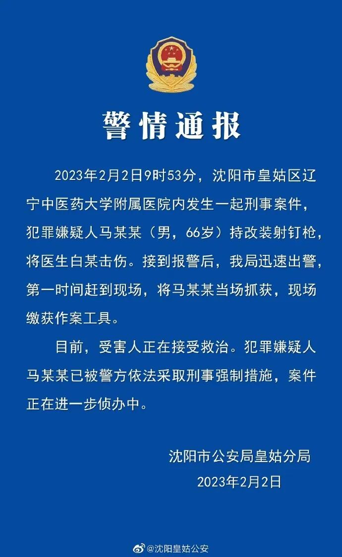 此前,沈阳警方发布警情通报:2023年2月2日9时53分,沈阳市皇姑区辽宁中医药大学附属医院内发生一起刑事案件,犯罪嫌疑人马某某(男,66岁)持改装射钉枪,将医生白某击伤。接到报警后,我局迅速出警,第一时间赶到现场,将马某某当场抓获,现场缴获作案工具。