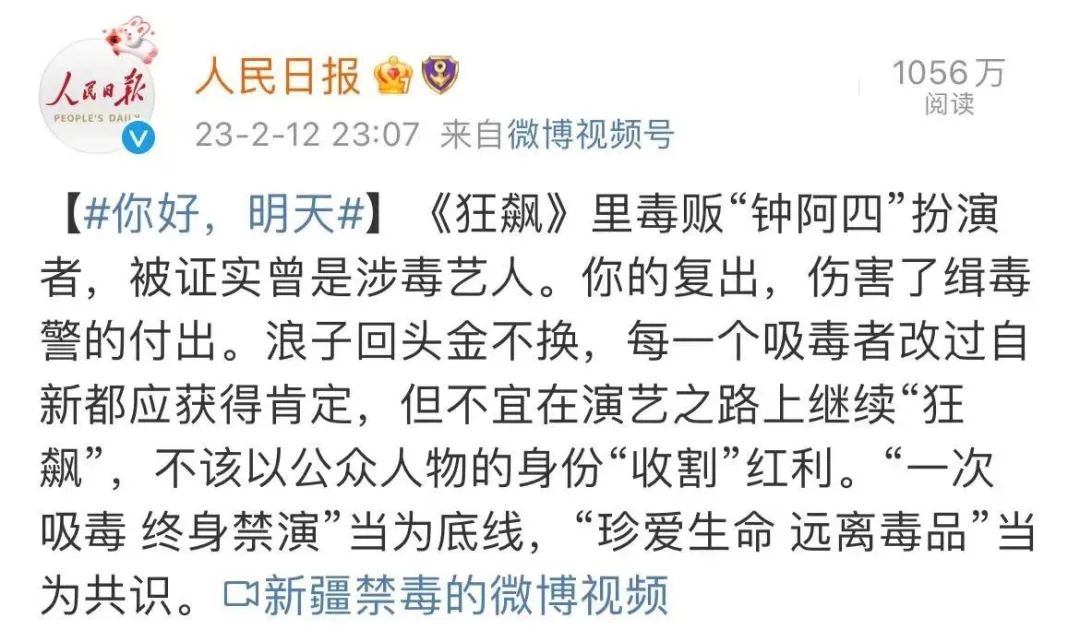 12日深夜,@人民日报 表示,浪子回头金不换,每一个吸毒者改过自新都应获得肯定,但不宜在演艺之路上继续“狂飙”,不该以公众人物的身份“收割”红利。