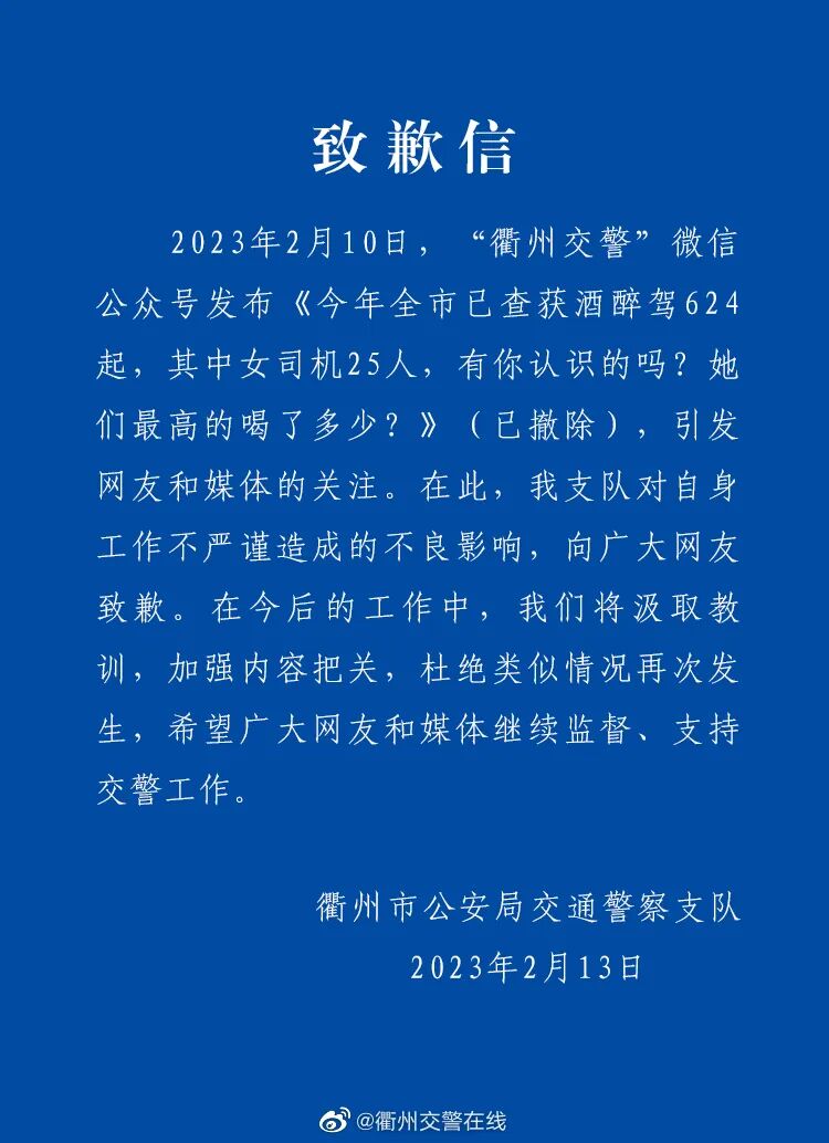 2月13日下午,浙江衢州市公安局交警支队官方微博发布致歉信,对自身工作不严谨造成的不良影响,向网友致歉。