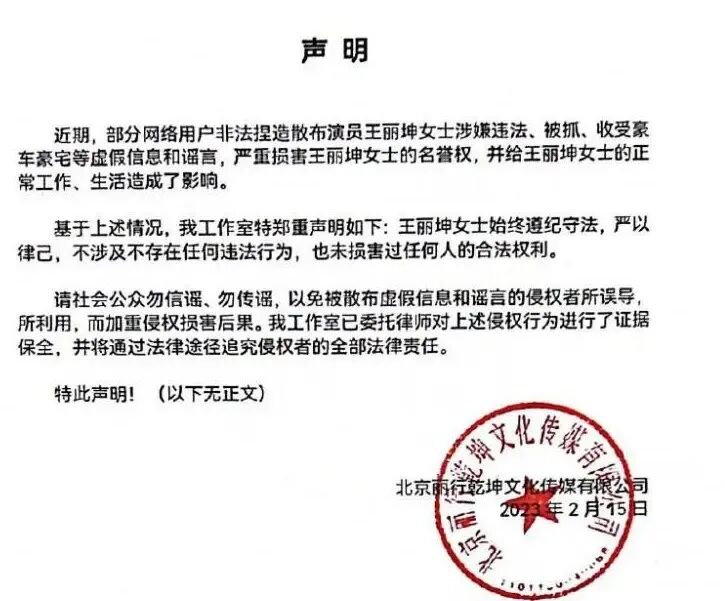 其工作室发布的声明称:近期,部分网络用户捏造散布王丽坤涉嫌违法、被抓、收受豪车豪宅等虚假信息和谣言,已严重损害王丽坤的名誉权。