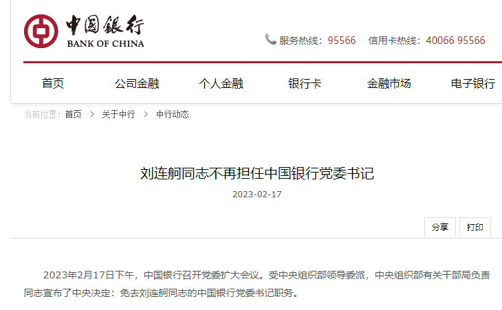 2月17日,据中国银行官网信息,下午,该行召开党委扩大会议。受中央组织部领导委派,中央组织部有关干部局负责同志宣布中央决定:免去刘连舸同志的中国银行党委书记职务。