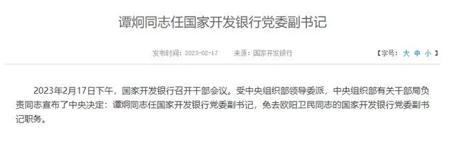 据国家开发银行官网消息,2月17日下午,国家开发银行召开干部会议。受中央组织部领导委派,中央组织部有关干部局负责同志宣布了中央决定:谭炯同志任国家开发银行党委副书记,免去欧阳卫民同志的国家开发银行党委副书记职务。
