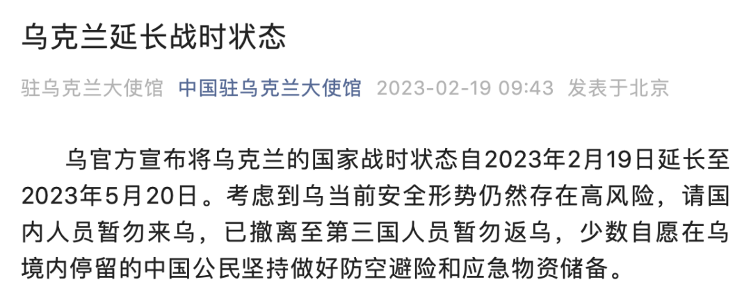 据中国驻乌克兰大使馆2月19日消息,乌官方宣布将乌克兰的国家战时状态自2023年2月19日延长至2023年5月20日。