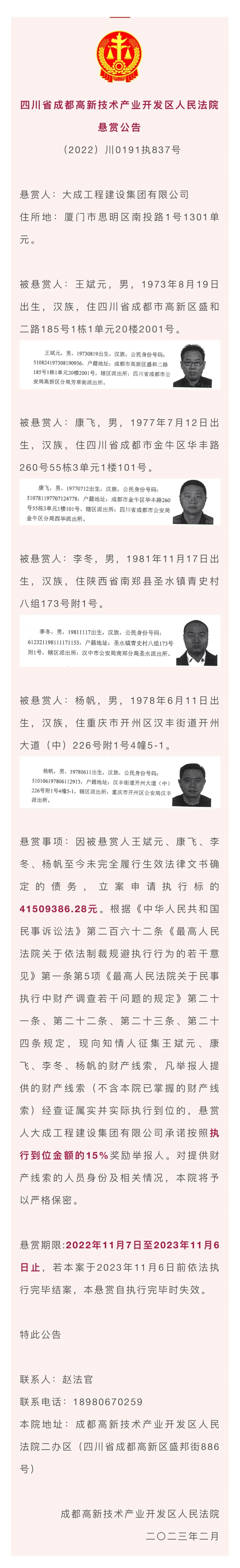 2月17日,成都高新法院发布悬赏公告,最高奖百万。看到这4个人请立即举报。