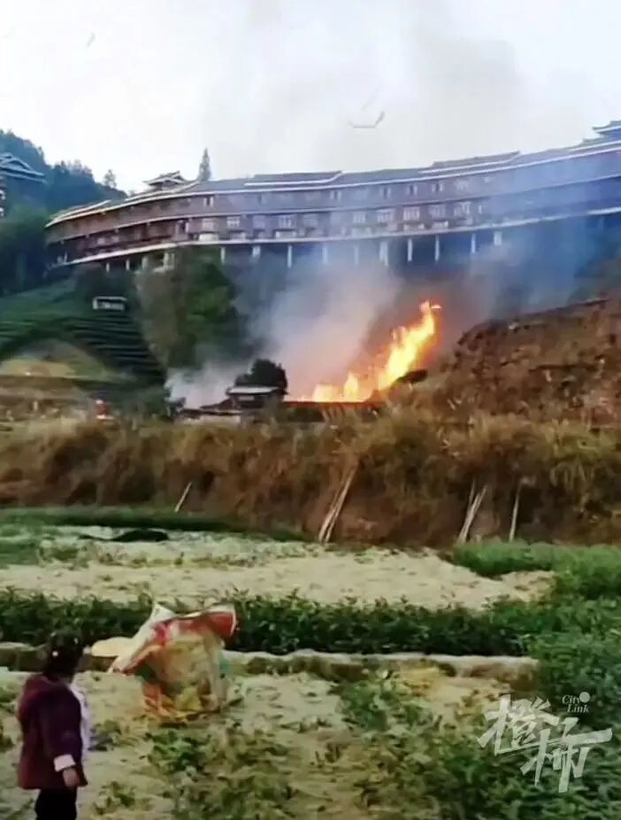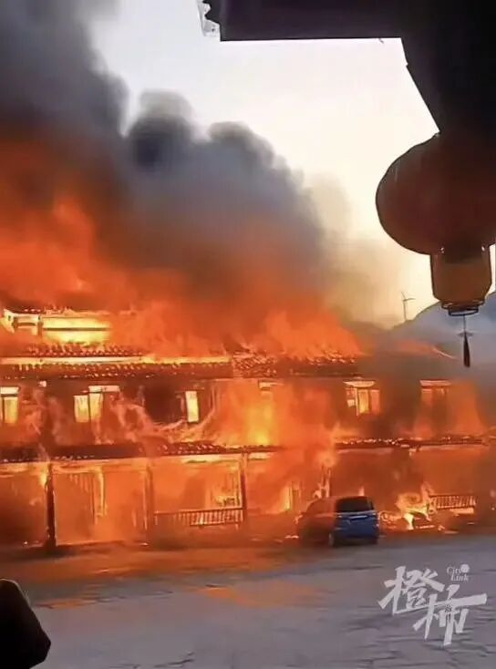 有视频拍到,大火前,有人在长廊建筑附近的田间地头焚烧,最后火势蔓延到长廊建筑群里。