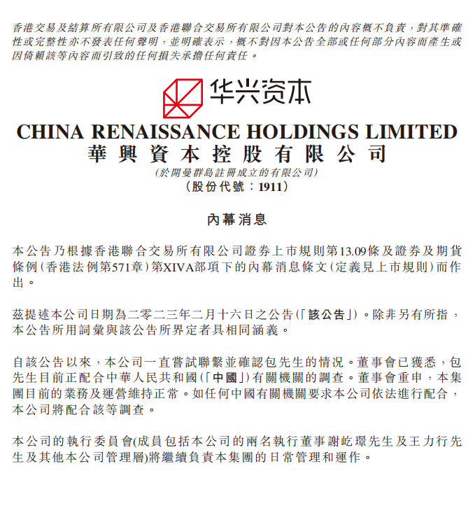 2月16日晚,华兴资本控股在港交所公告称,集团的董事会得悉公司暂时无法与包凡(公司董事会主席、执行董事、首席执行官和控股股东)取得联系。董事会并不知悉任何资料显示包凡失去联络一事与或可能与该集团的业务和或运作有关,而该集团目前业务及运作维持正常。