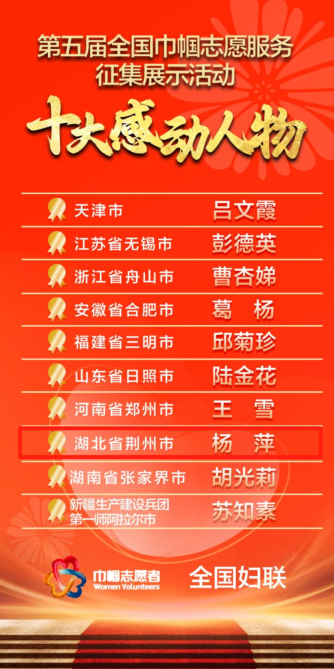3月3日全国妇联启动2023年全国文明实践巾帼志愿阳光行动举办全国巾帼志愿服务征集展示活动揭晓仪式在现场揭晓,仪式上全国妇联公布了全国巾帼志愿服务“十大感动人物”,荆州市公安县巾帼志愿者杨萍荣誉上榜。