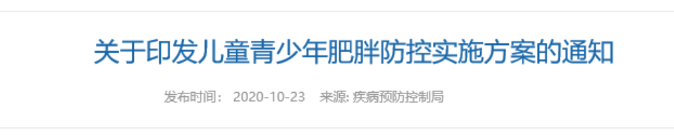 2020年10月16日,国家卫健委、教育部、市场监管总局等六大部门发布《儿童青少年肥胖防控实施方案》提出,2020~ 2030年部分地区0~18岁儿童青少年超重率和肥胖率年均增幅要在基线基础上下70%!