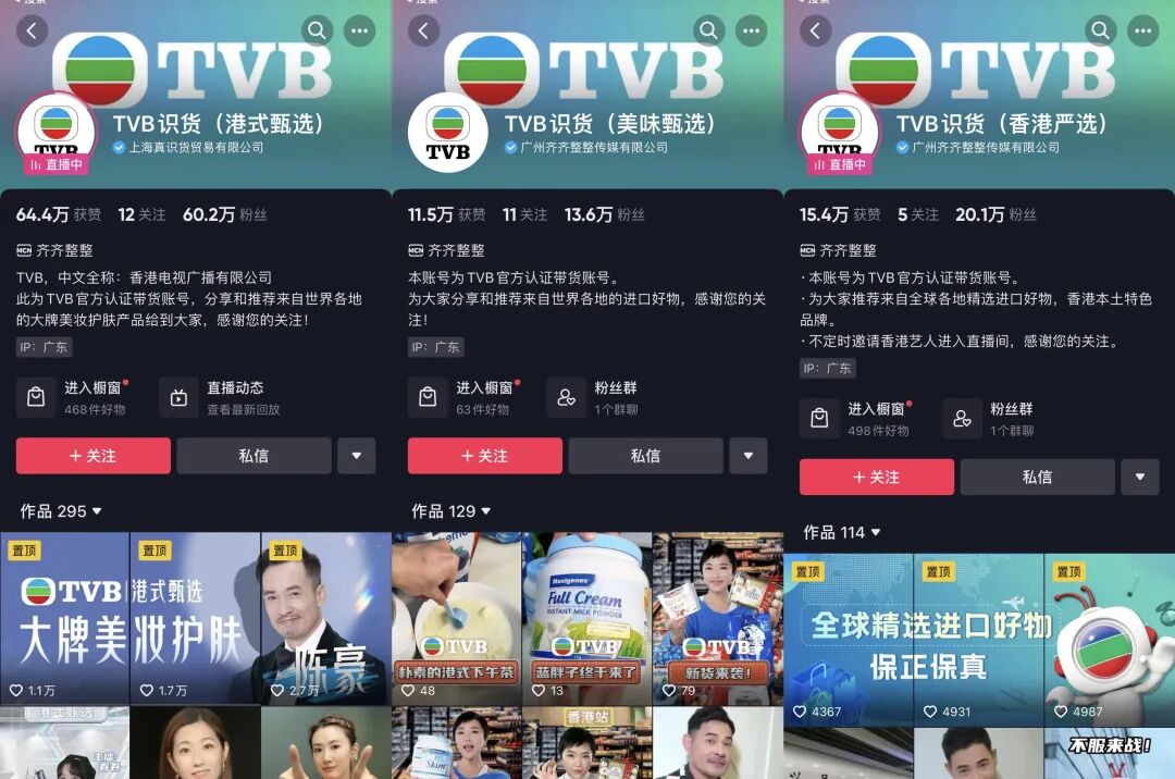 据了解,此次并非TVB首次试水直播带货行业。2022年4月,TVB入驻抖音直播,在官方账号以外,开通了3个直播带货账号,分别为TVB识货(港式甄选)、TVB识货(美味甄选)和TVB识货(香港严选),由上海真识货贸易有限公司和广州齐齐整整传媒有限公司运营,累计粉丝量接近94万。