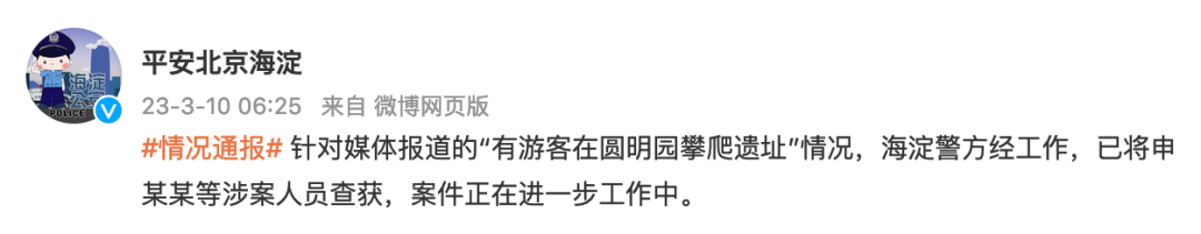在发现网上相关报道后,圆明园管理处第一时间与属地警方联系。海淀公安分局官方微博10日早上发布通报称,针对媒体报道的“有游客在圆明园攀爬遗址”情况,海淀警方经工作,已将申某某等涉案人员查获,案件正在进一步工作中。