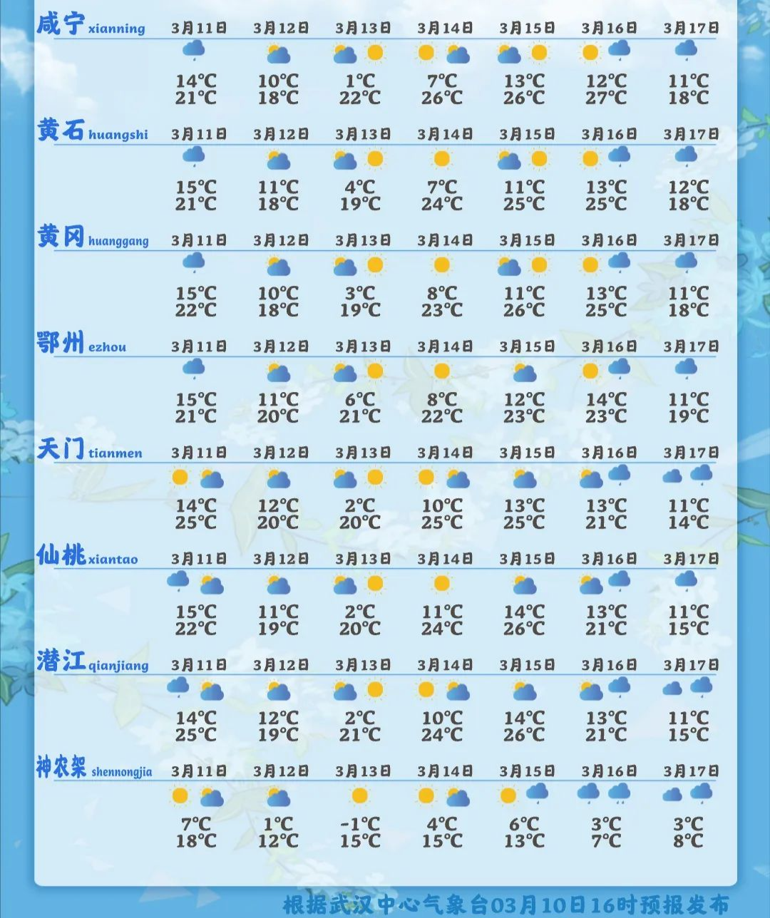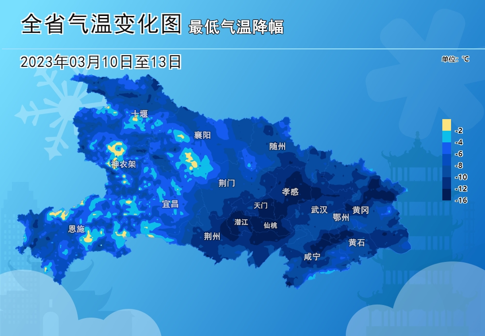 预计3月11-12日,受较强冷空气影响,湖北省将有大风降温天气。过程降温幅度一般7~9℃、局部10℃以上,3月13日早晨,最低气温大部地区降至3~6℃;全省有偏北风4到5级、阵风7到9级;3月10日夜间至11日南部有小雨、局部中雨。