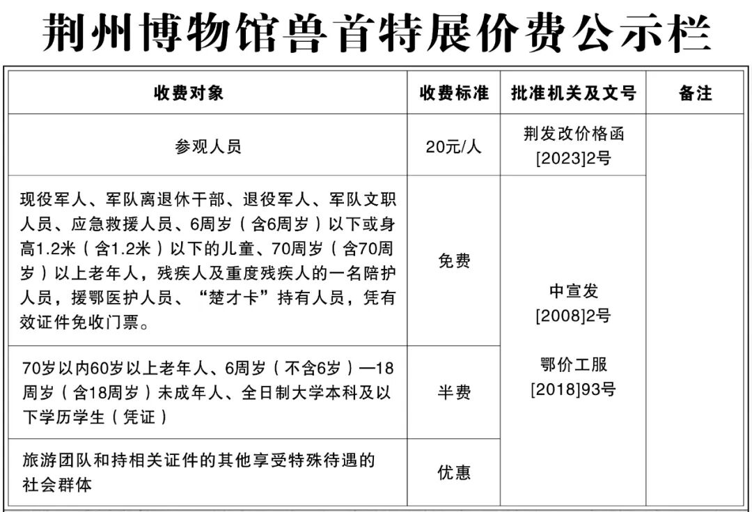 看这里!圆明园兽首特展以下人群有优惠! 2023-03-11 14:50 荆州文旅之声 3 (点击可查看大图) 举报电话:12315 注: 1、线下临时展厅购票处出示相关证件即可享受相应优惠。 2、荆州市基干民兵凭有效证件免费观展