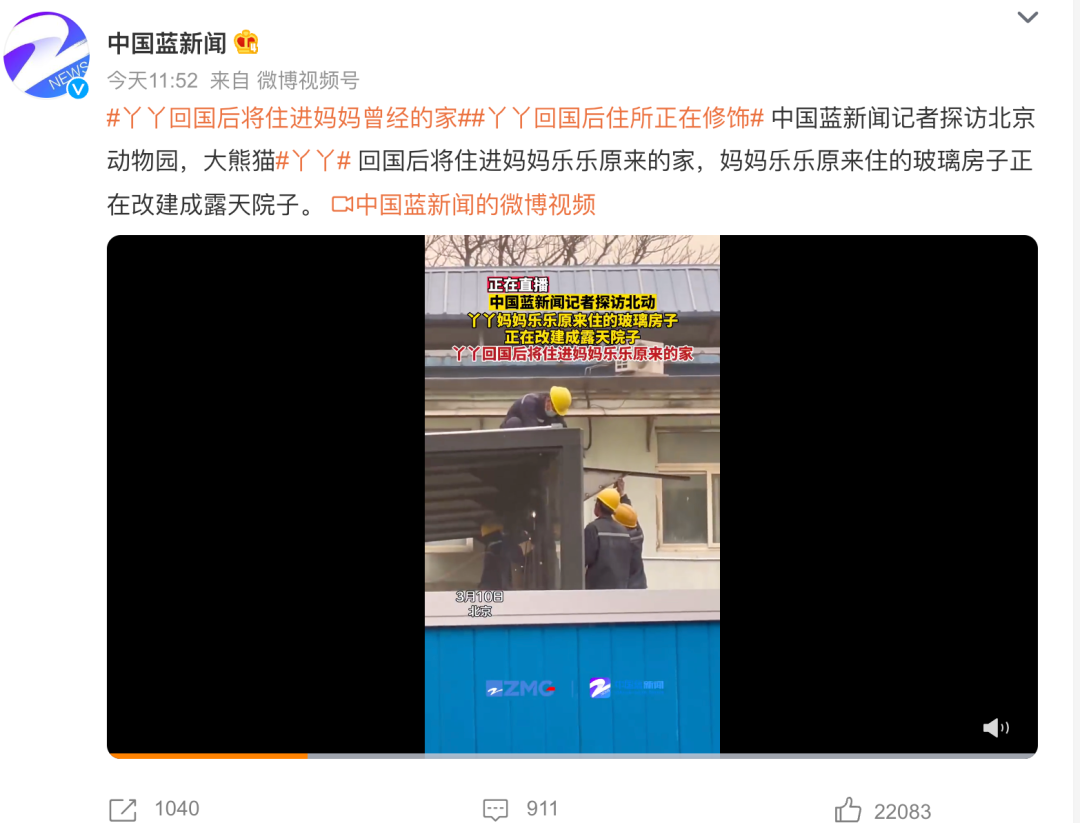 中国蓝新闻记者探访北京动物园,大熊猫丫丫回国后将住进妈妈乐乐原来的家,妈妈乐乐原来住的玻璃房子正在改建成露天院子。