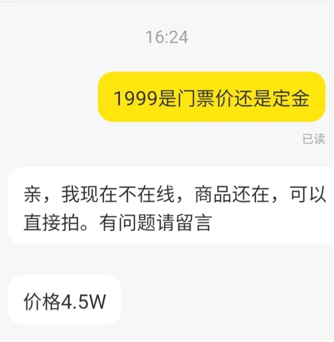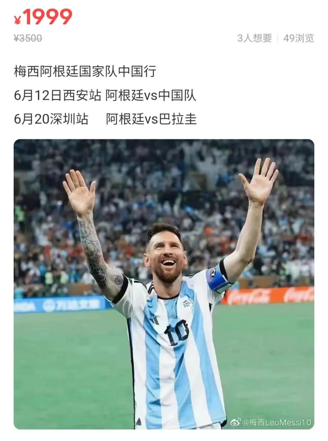 极目新闻记者注意到,在一些二手交易平台和社交网络,已有人在叫卖阿根廷国家队中国行的门票,称6月12日西安站为阿根廷队对战中国队,6月20日深圳站为阿根廷队对战巴拉圭队。有的商品售价为1999元,极目新闻记者私信该卖家,询问1999元是定金还是门票,对方回复称价格为4.5万元。