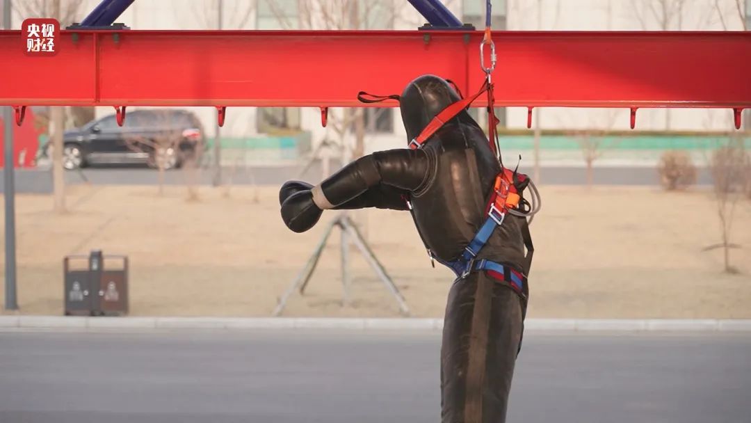 第二次实验时,由于坠落冲击力巨大,假人的两个手臂被系在腰间的安全绳瞬间撕裂,飞离躯干。