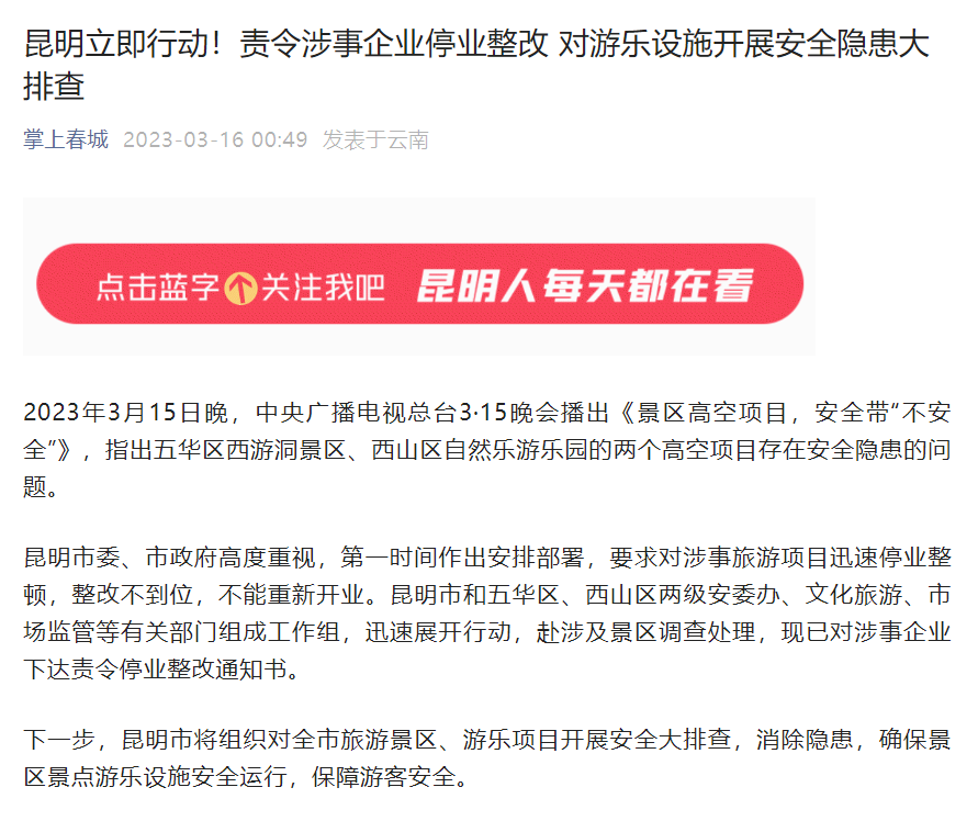 另据掌上春城微信公号消息,2023年3月15日晚,中央广播电视总台3·15晚会播出《景区高空项目,安全带“不安全”》,指出五华区西游洞景区、西山区自然乐游乐园的两个高空项目存在安全隐患的问题。