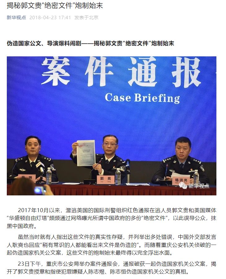 2018年,重庆市公安局举办案件通报会,通报破获一起伪造国家机关公文案,揭开了郭文贵授意和指使犯罪嫌疑人陈志煜、陈志恒伪造国家机关公文的真相。