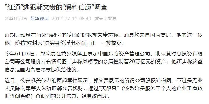 2017年,新华社发文称,6月16日,郭文贵在境外媒体上展示中国东方资产管理公司、北京慧时恩投资有限公司等公司股份持有情况图,声称某领导的亲属控制着20万亿元的资产,他还声称这些信息是国内高层领导提供给他的。