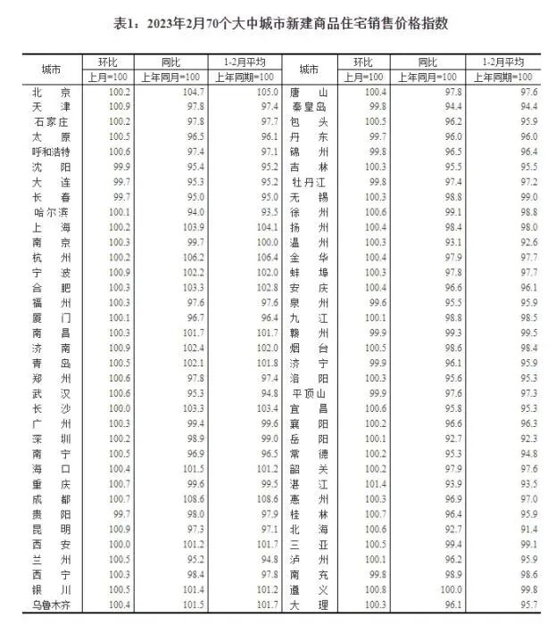 2023年2月70个大中城市新建商品住宅销售价格指数。截图自国家统计局官网