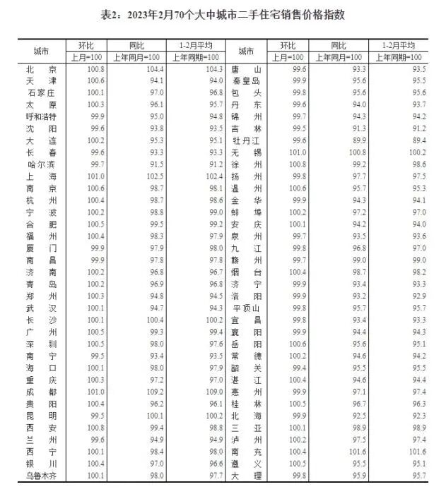 2023年2月70个大中城市二手住宅销售价格指数。截图自国家统计局官网
