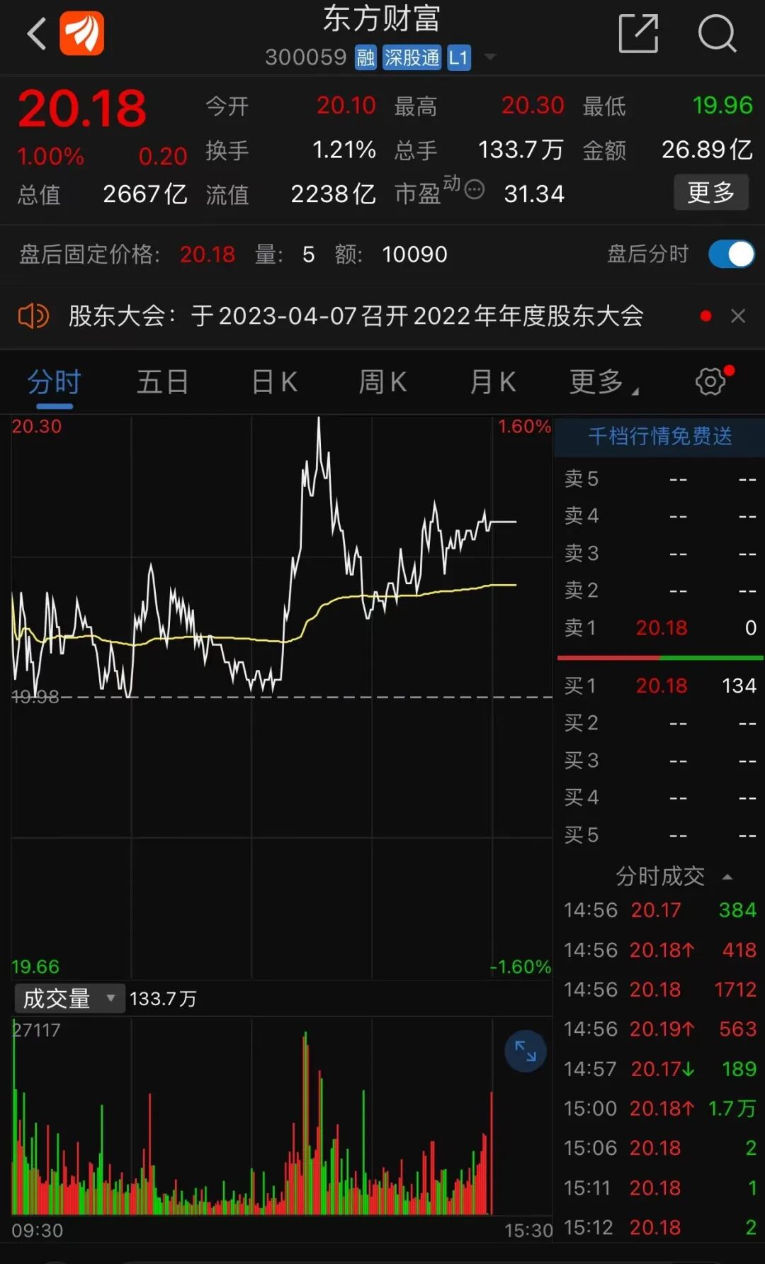 二级市场上,东方财富股价早间表现平淡,午后冲高回落,截至今日收盘,涨1.00%。