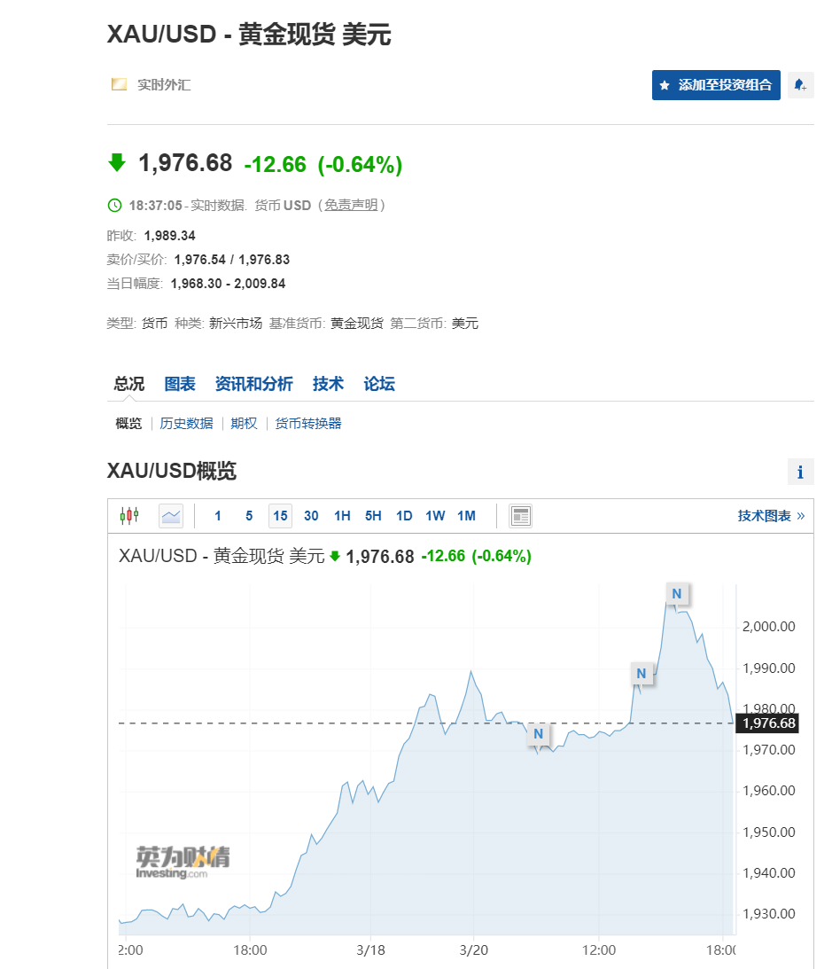 3月20日,现货黄金盘中一度站上2000美元/盎司,为2022年3月来首次,随后出现冲高回落。