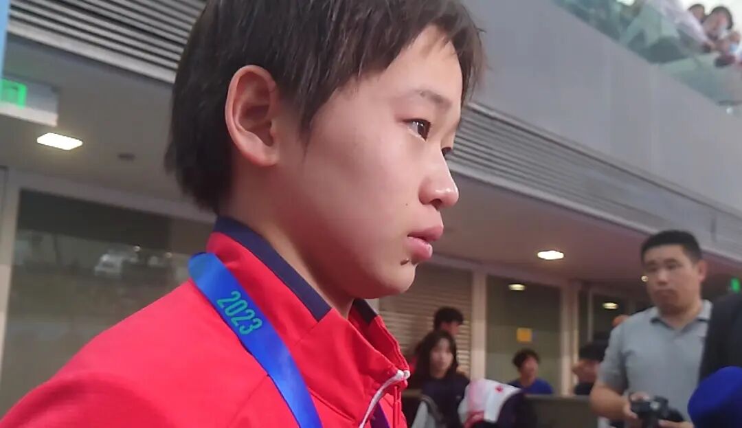 全红婵带着泪花接受采访。 澎湃新闻记者 蒲垚磊 图