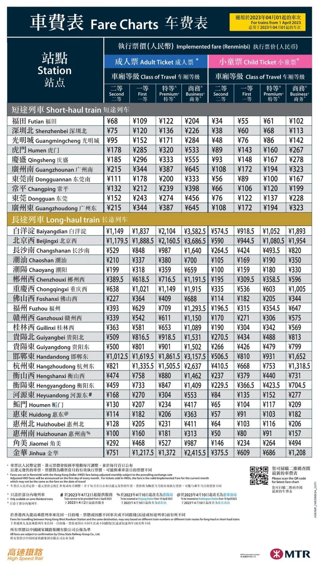 港铁分“公布票价”和“执行票价”两个价格公布了香港前往66个内地车站的票价。“公布票价”为原价,“执行票价”为发售价。