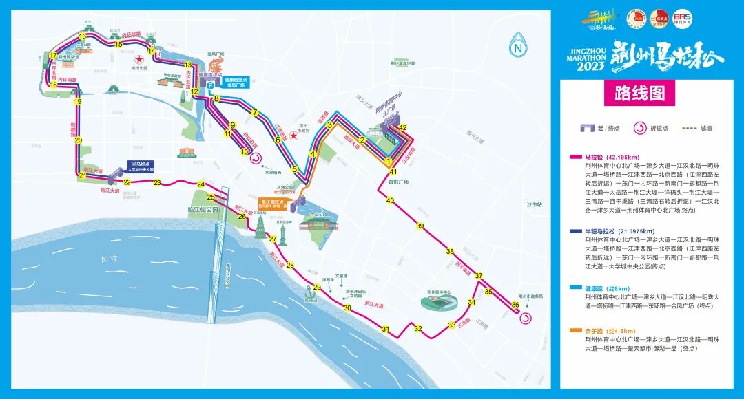 荆州体育中心北广场—津乡大道—右转进入江汉北路—右转进入明珠大道—左转进入塔桥路—右转进入江津西路—东门路口左转上北京西路(原市行政服务中心门前折返)—东门路口—右转进内环路—右转进入新南门—郢都路—左转进入荆江大道—太岳路右转沿西侧滑坡上荆江大堤—左转上荆江大堤—进入洋码头—荆江大堤—三湾路—右转进入西干渠路(约1300米后折返)—西干渠路—右转进入江汉北路—左转进入津乡大道—荆州体育中心北广场(终点)