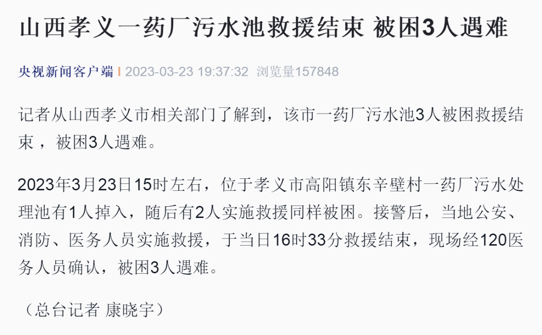 据央视新闻客户端消息,记者从山西孝义市相关部门了解到,该市一药厂污水池3人被困救援结束 ,被困3人遇难。