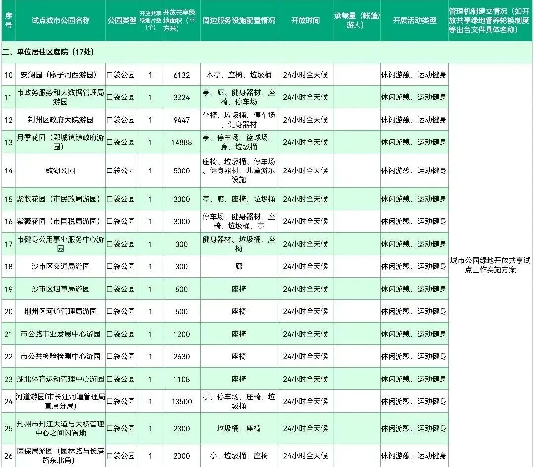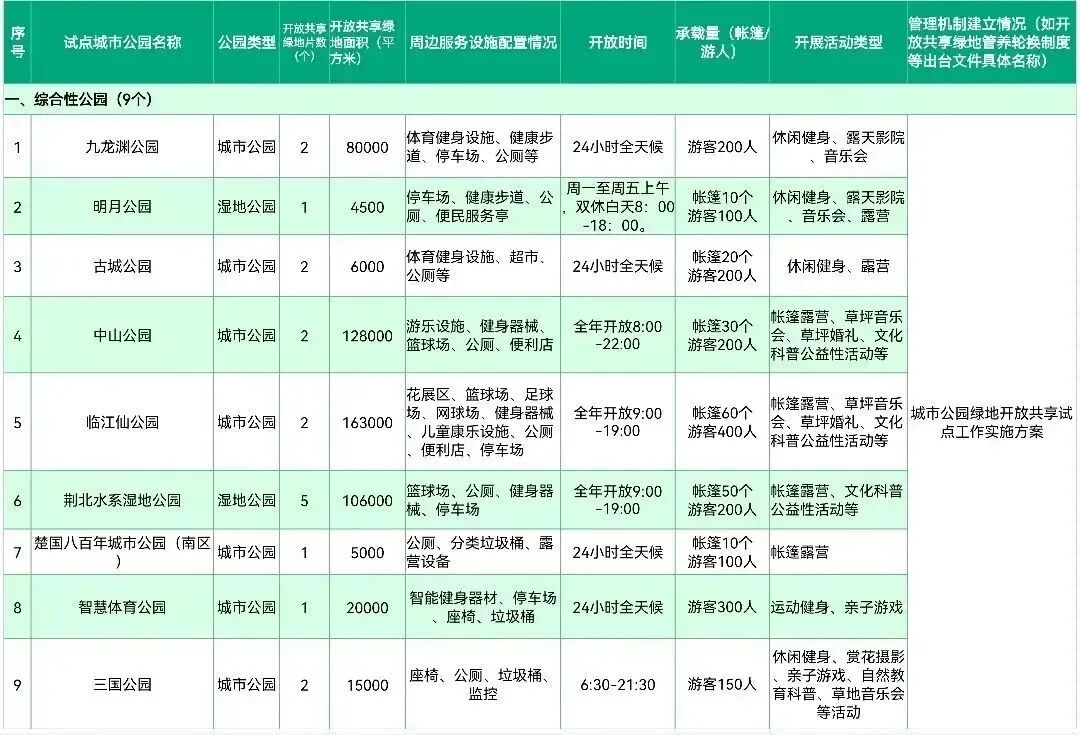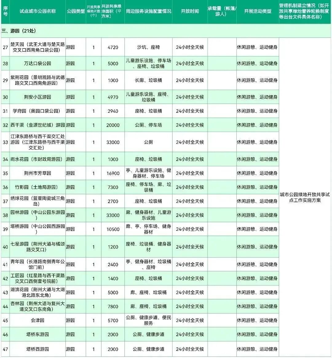 2023年,在荆州市中心城区首批开放共享公园试点47个,绿地片数共56个,主要以草坪、林下空间为主,其中综合性公园9个、游园21个、单位居住区庭院17个,总绿地面积76.7059万平方米。