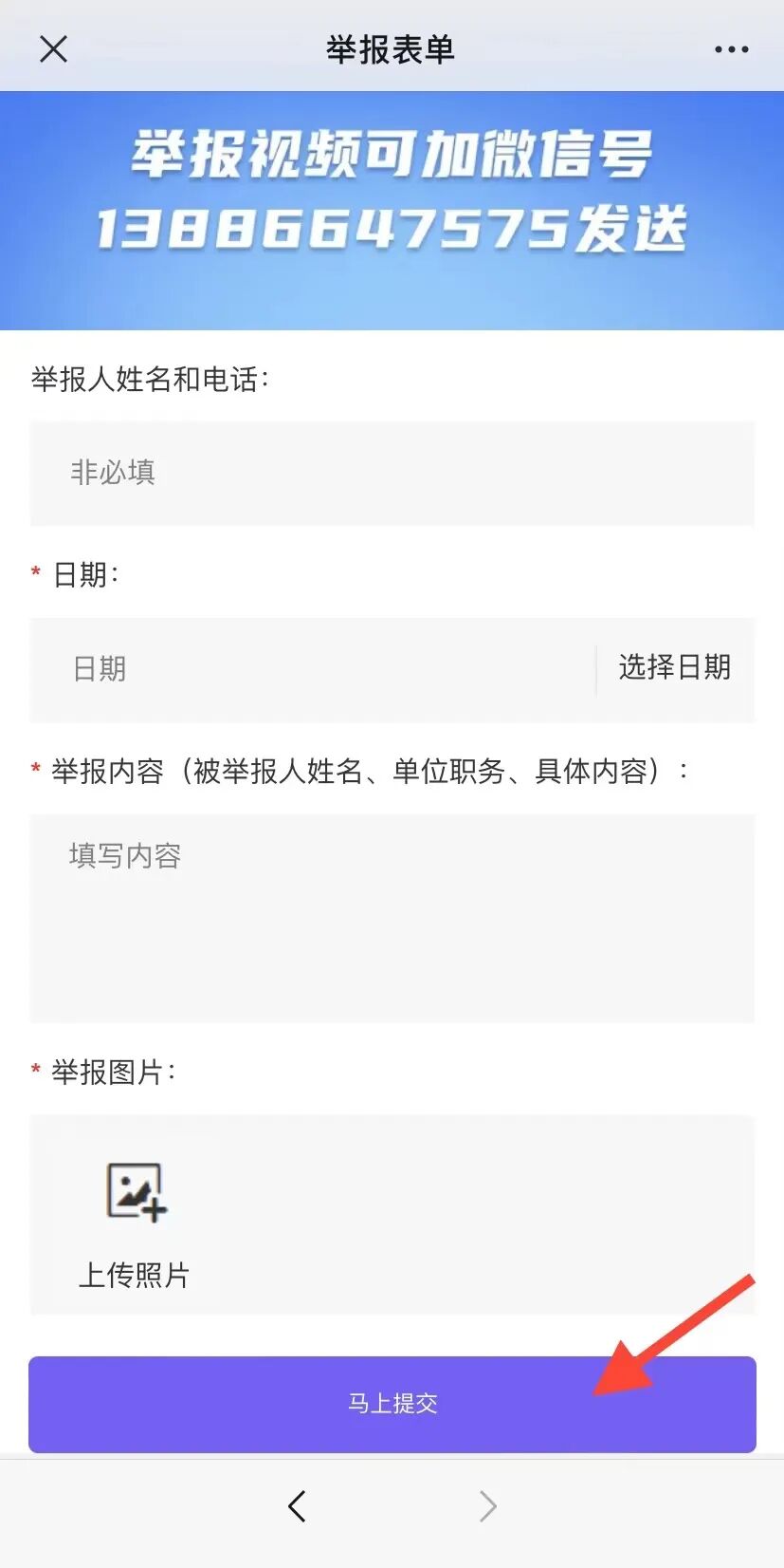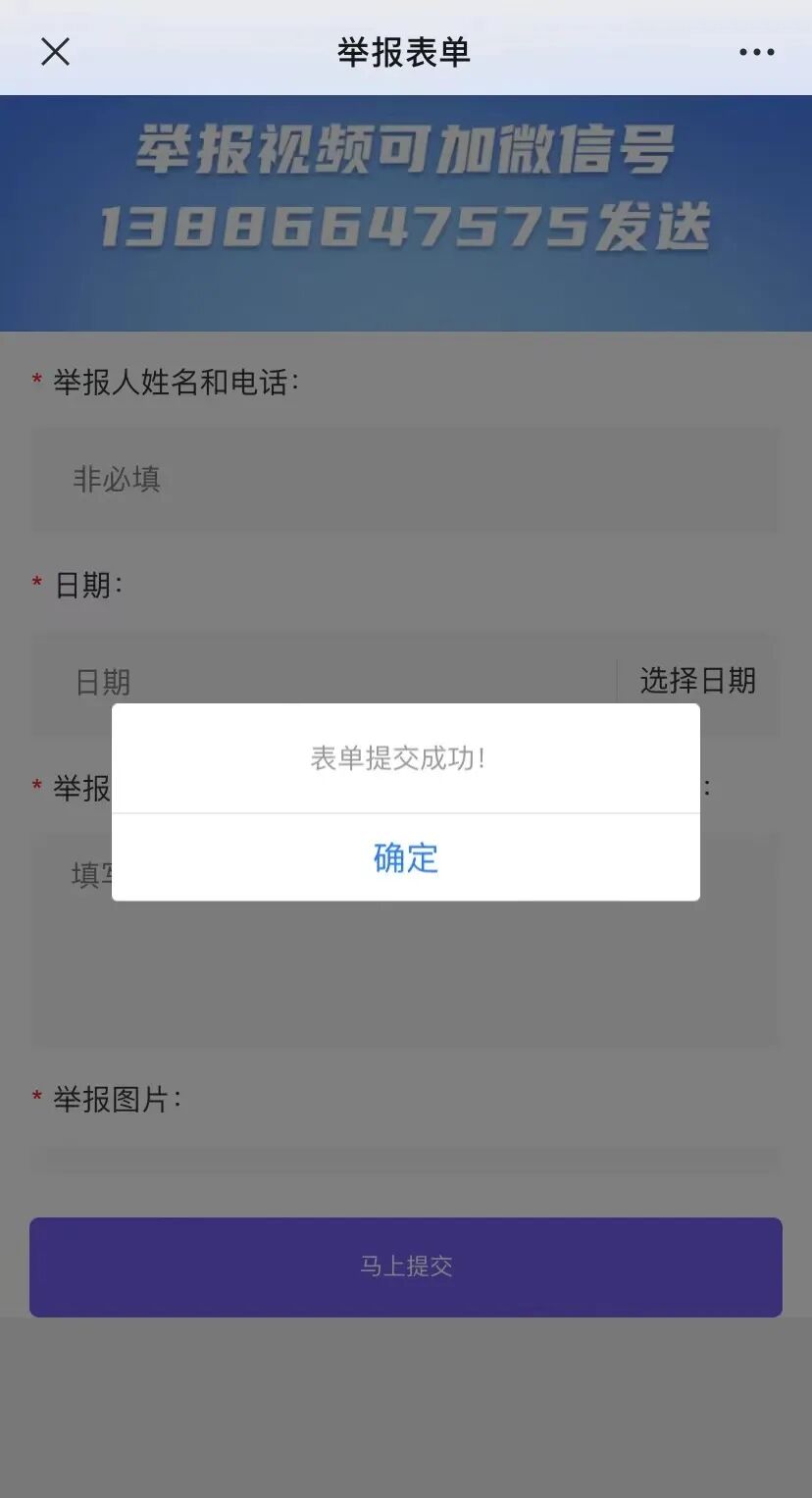 进入举报表单,可输入详细的举报信息。为切实提高举报问题的有效性和处理效率,请注明问题发生的时间地点及被反映对象,上传图片或视频材料作为附件佐证,完成以上操作后点击“马上提交”,显示“表单提交成功”即完成一键举报。