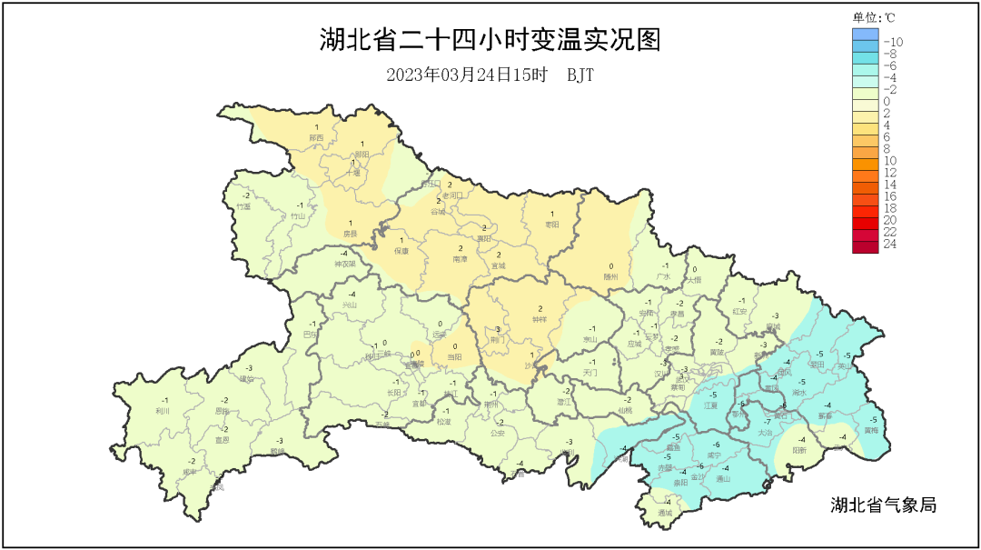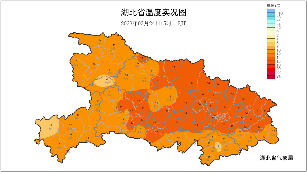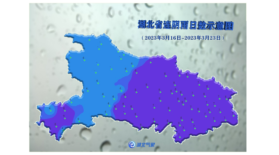自3月16日起,湖北省大部地区开启了近期的连阴雨天气过程,累积雨量呈现出北少南多,全省平均雨量26.1毫米,其中南部30~70毫米。从连阴雨过程的强度来看,鄂东南,鄂东北南部,以及荆州南部的部分地区达到中等强度,鄂西南,江汉平原大部,鄂东北北部等地达到轻度强度。从阴雨日数来看,截至昨天(23日),中东部地区普遍达到8天,西部地区大多是4天。