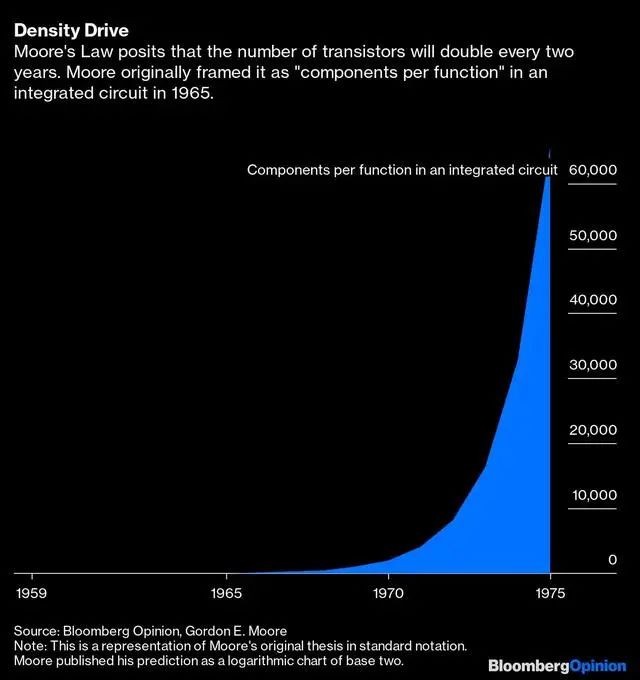 1965年,戈登·摩尔在他撰写的一篇文章中提出,由于技术的进步,自集成电路被发明以来,微芯片上的晶体管密度每18个月翻一番,性能也将提升一倍。换言之,每一美元所能买到的电脑性能,将每隔18个月翻两倍以上。