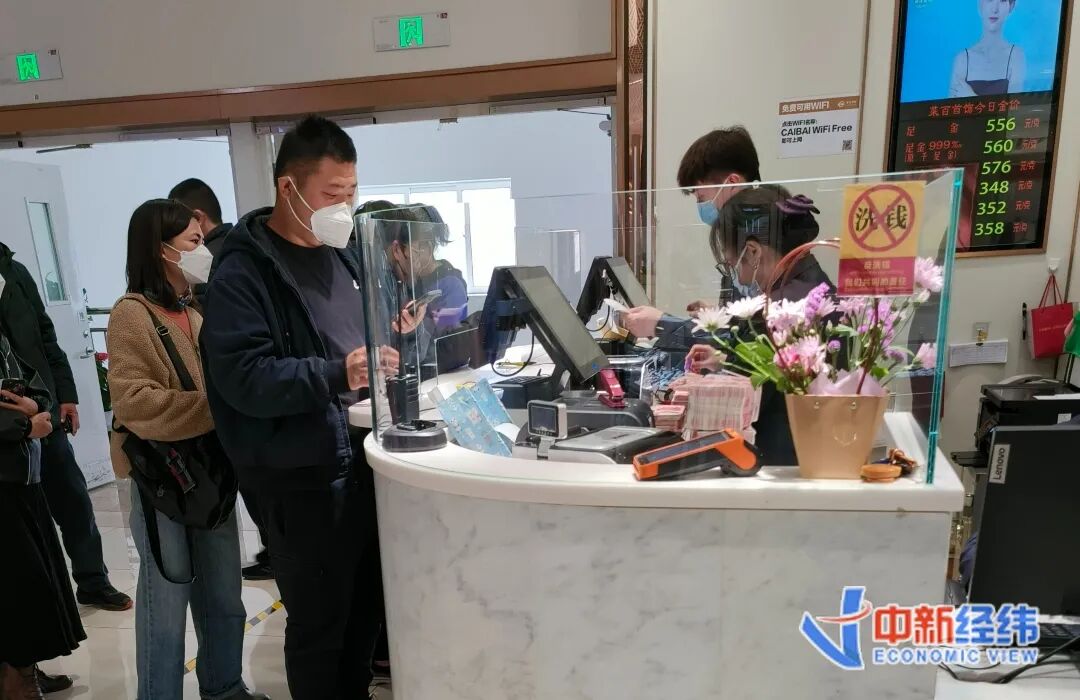 四楼售卖投资金条的柜台前也是客流不断,收银台前约有10人在排队,有大概四五位顾客均直接是现金交易,柜台上已经摞了好几叠钞票。一对夫妻刚刚买了30克的投资金条,对前来走访的记者表示,“钱存银行,利息太低了,不如买点金条,这个还能给孩子。”