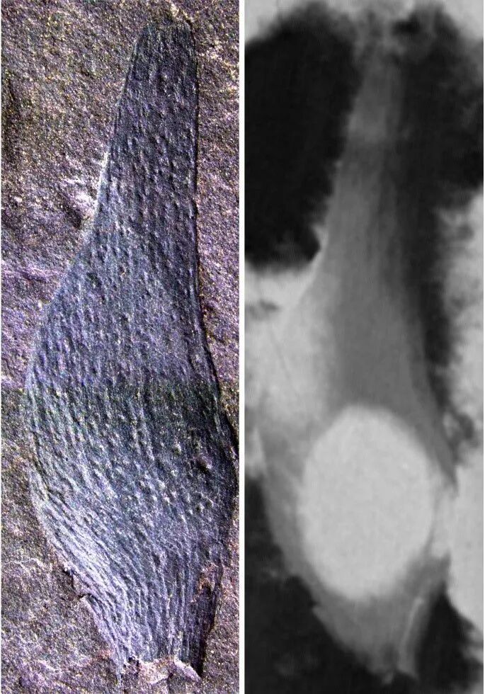 美丽青甘宁果序的一个果实(左)和果实内的一个胚珠(右)(中科院南京地质古生物研究所供图)
