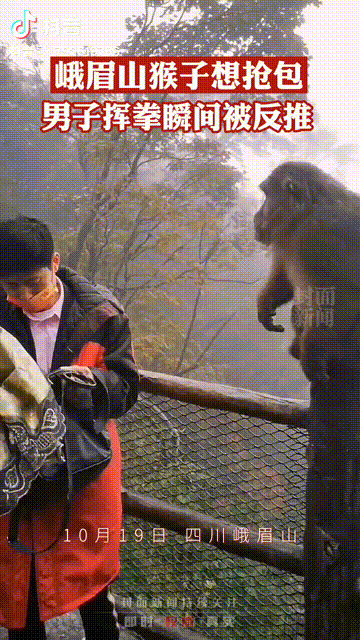 3月26日,江苏苏州,网传视频显示,一女子在景区游玩时,试图用一盒菠萝投喂停留在栏杆上的猴子。但是当她放下果盒时,原本停留在栏杆上的猴子却突然冲向前,向女游客发起进攻,结结实实打了女游客一巴掌。