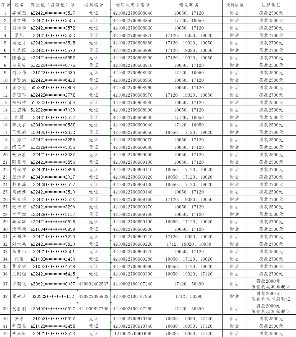 下列机动车驾驶人因违反道路交通安全法律法规,经公安机关交通管理部门通知、公告告知后逾期未接受处理,也未提出陈述和申辩或要求听证,依据《中华人民共和国道路交通安全法》等规定,现对其依法作出行政处罚决定。根据《中华人民共和国行政处罚法》第六十一条、《道路交通安全违法行为处理程序规定》第五十六条之规定,已对其进行邮寄或电子送达,现进行公告送达。